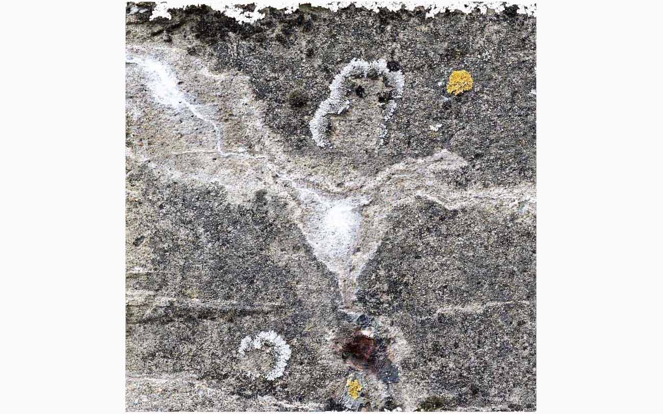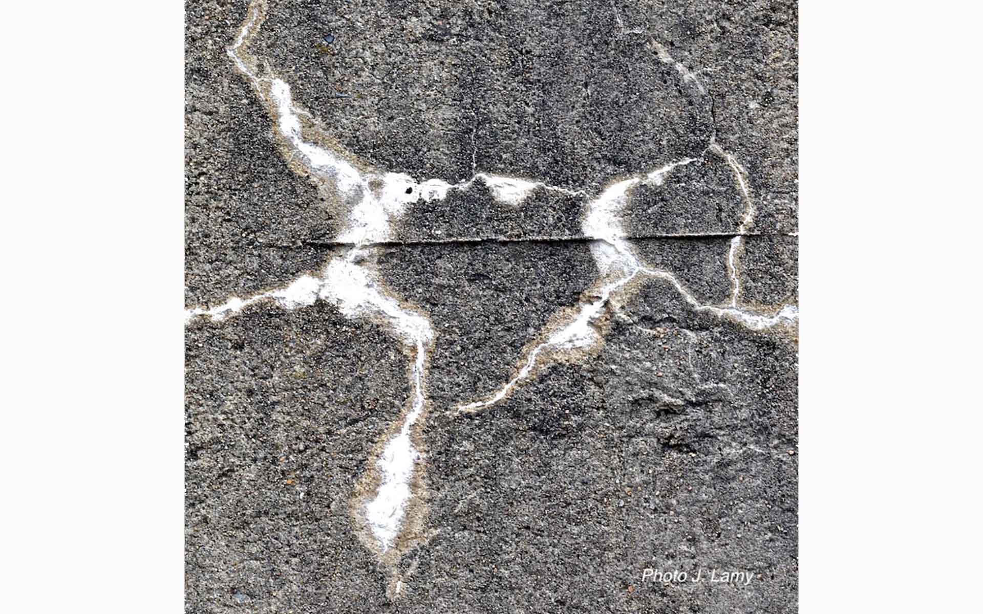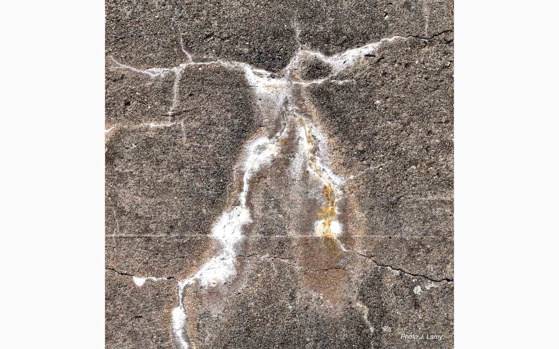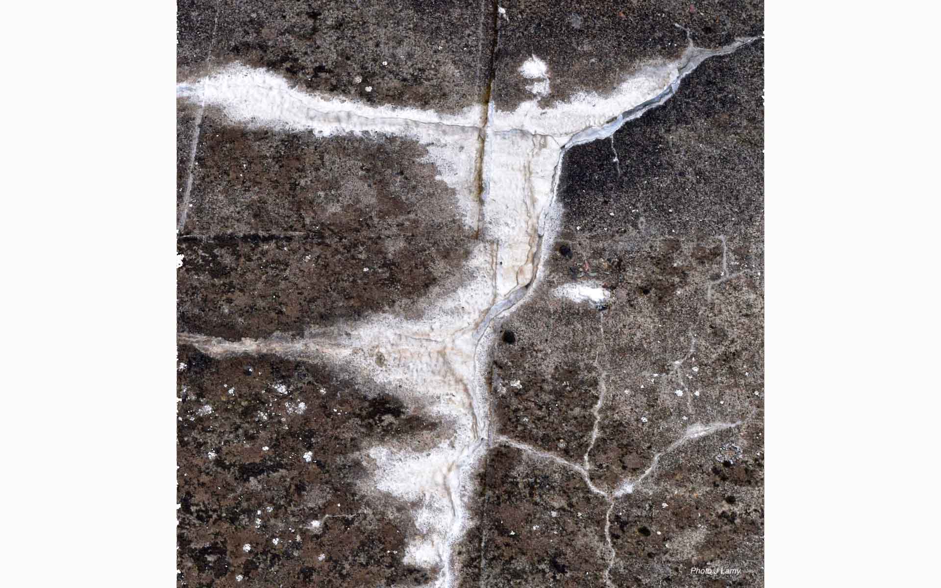 Malgré sa compacité, le béton vieillit. Il se lézarde et suinte. Produites par les infiltrations, les coulures laiteuses nourrissent le révélateur involontaire de figures qui tiennent de la fantasmagorie ou des tests de H. Rorschach.